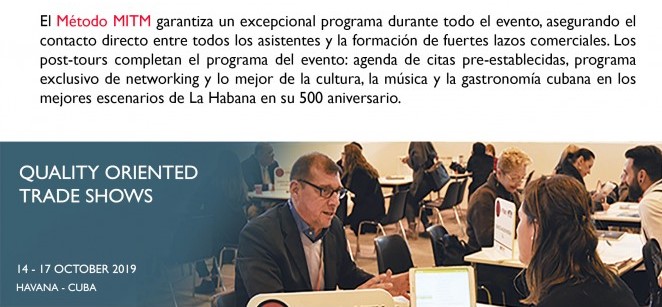 Tras el éxito de la 22ª MITM Americas, este año la 23ª edición de MITM Americas, la feria más influyente de las Américas y el Caribe, se celebrará del 14 al 17 de octubre en el Hotel Nacional de Cuba, coincidiendo con las celebraciones del 500 aniversario de la ciudad de La Habana, y contará con el patrocinio del Ministerio de Turismo de Cuba, Gran Caribe Hotels & Resorts y el Hotel Nacional de Cuba, Cubatur e Iberia. Ofreciéndole la posibilidad de entrar en contacto con las principales empresas internacionales del sector MICE.