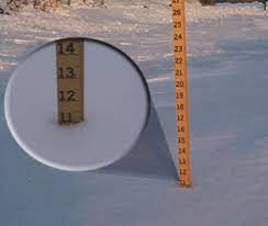 Ahora bien, la nieve se mide en forma similar. La regla de medir se empuja directamente en la nieve, perpendicular al suelo, hasta que llegue al fondo. La nieve caída (nieve recién caída) se reporta en pulgadas y décimas de pulgada (como 2.4"). Se toma la medición tan pronto como la nieve haya dejado de caer, si es posible, y no más de 4 veces al día. La profundidad de la nieve (profundidad total de nieve en el suelo) se informa a la pulgada entera más cercana (como 11").