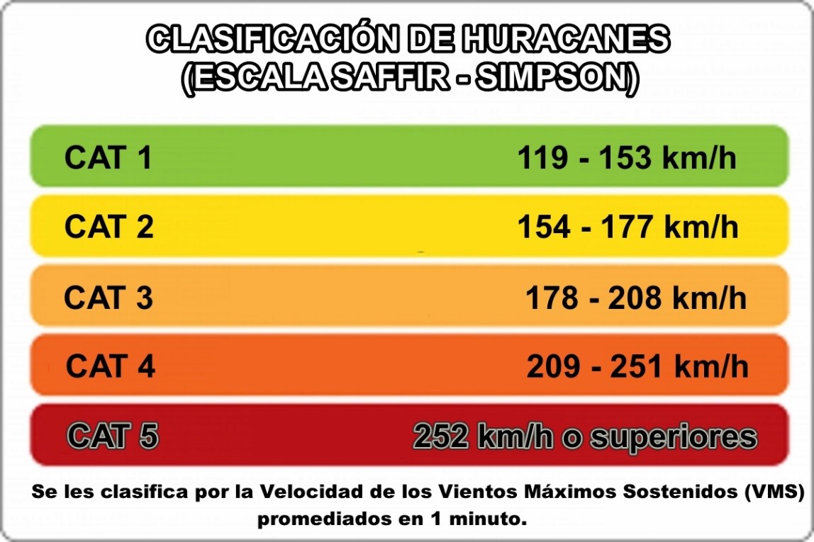 Para los huracanes, existe además la Escala Saffir Simpson de 5 Categorías, que aparece en la Tabla 2. Los huracanes Categorías 1 y 2 son Huracanes de Poca Intensidad, y los de categoría 3, 4 y 5, se llaman Huracanes de Gran Intensidad.
