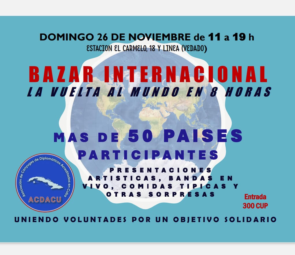 Con la participación de más de 50 países, el Bazar Internacional “La vuelta al mundo en 8 horas” tendrá lugar el próximo domingo 26 de noviembre, a partir de las 11:00 am y hasta las 7:00 pm, en la Estación Cultural El Carmelo, de Línea y 18, en El Vedado capitalino.