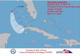 La depresión tropical Dos tiene una presión central de 1 007 hectoPascal y vientos máximos sostenidos de 55 kilómetros por hora, con rachas superiores. Se desplaza lentamente al sur a unos siete kilómetros por hora