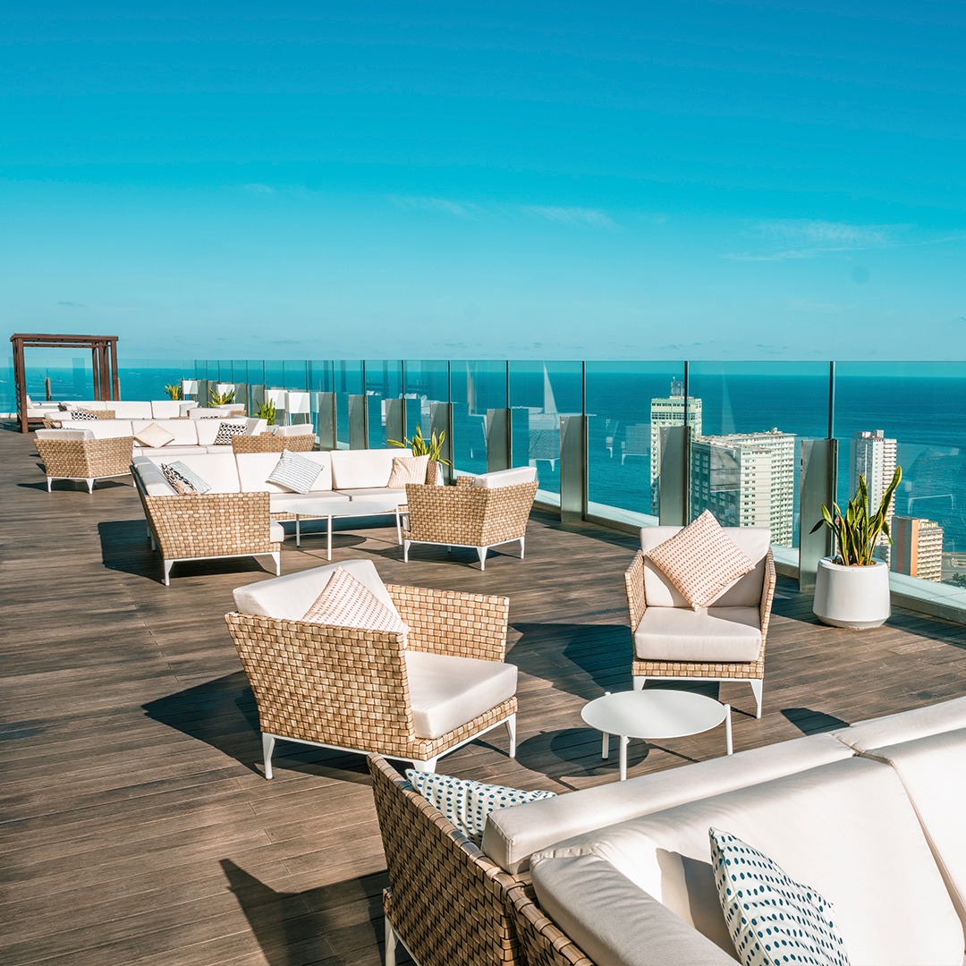 En el nivel cero, el restaurante “Taxi Driver” rinde homenaje al clásico estadounidense de 1976; el lobby bar del primer piso evoca “La Dolce Vita”, joya del cine italiano de 1960; mientras que en el segundo nivel se proyectarán filmes fundamentales del cine cubano. El restaurante buffet, bautizado como “Fresa y Chocolate”, y el snack bar piscina, llamado “Habanastation”, completan este tributo al arte cinematográfico nacional. En las alturas, la terraza del piso 32, denominada “Habana Selfies”, y el Sky Bar “Habana Blues” en el tope de la torre, ofrecerán panorámicas únicas de la ciudad.